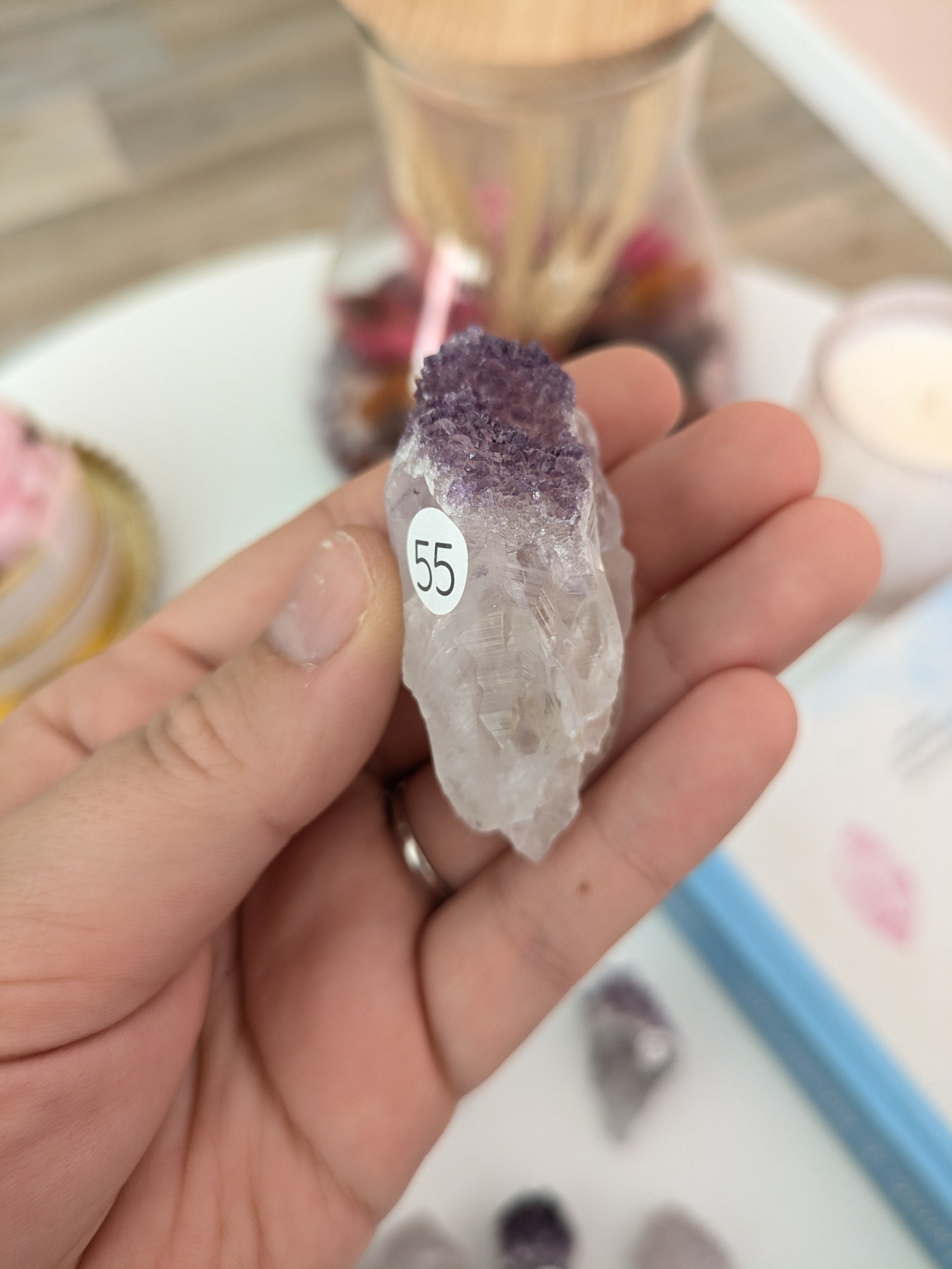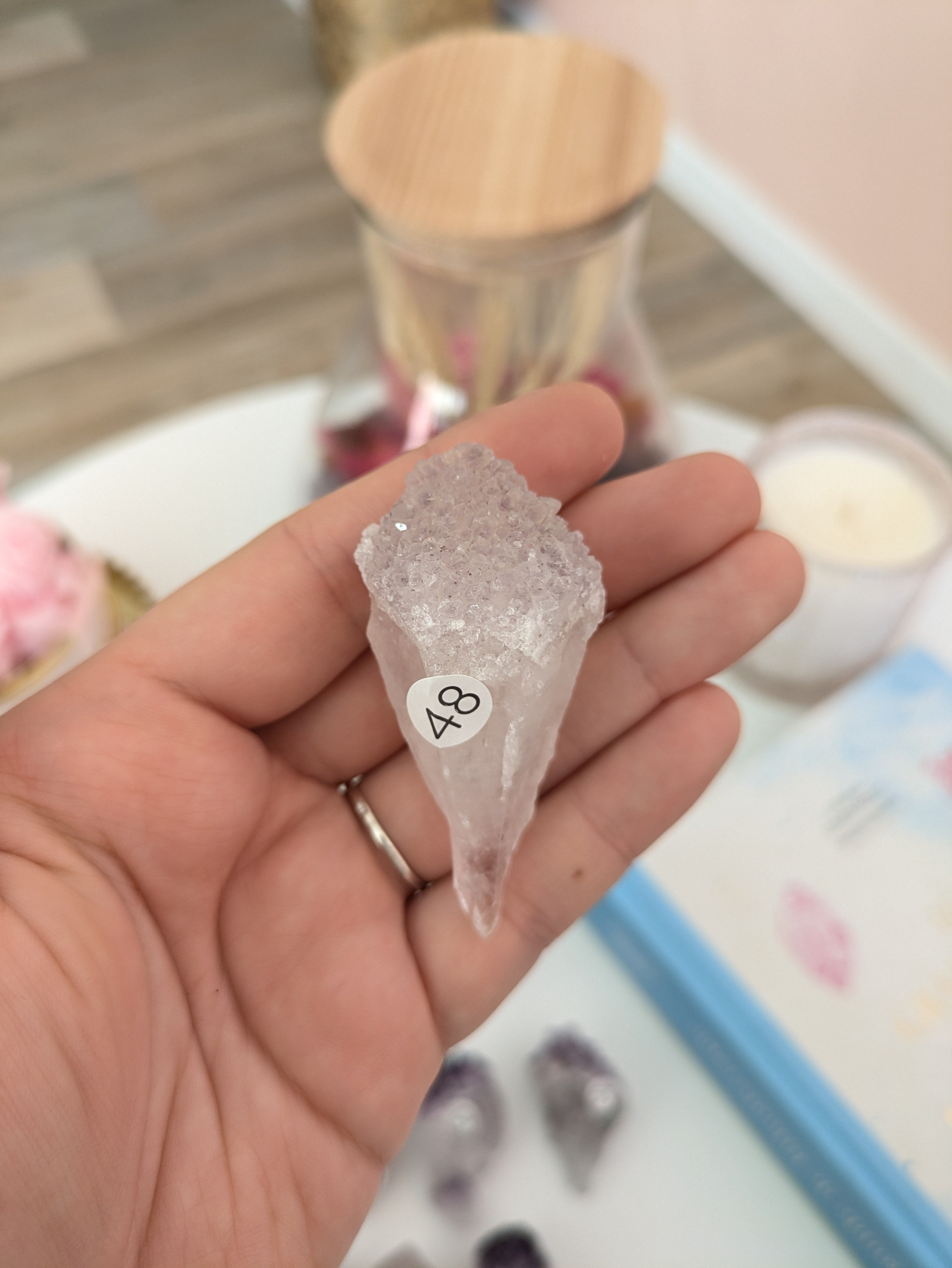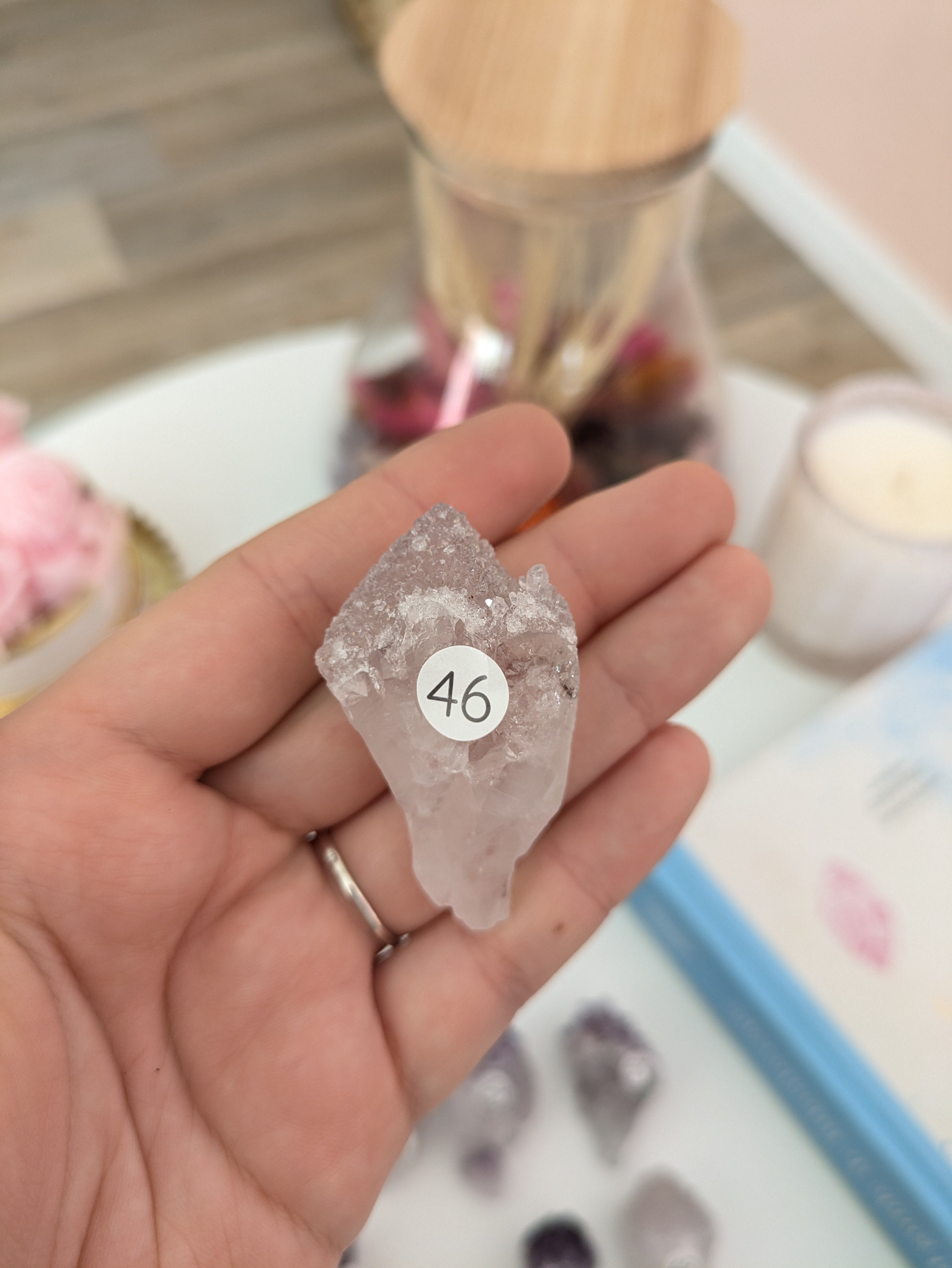 "la tranche d'agathe est juste magnifique, les jolies pierres roulées conformes à mes attentes, et la pierre mystère ... parfaite pour moi! la livraison a été rapide et la commande emballée avec soin. Un grand merci à Johanna. Je recommanderai ici, c'est sûr." Alex